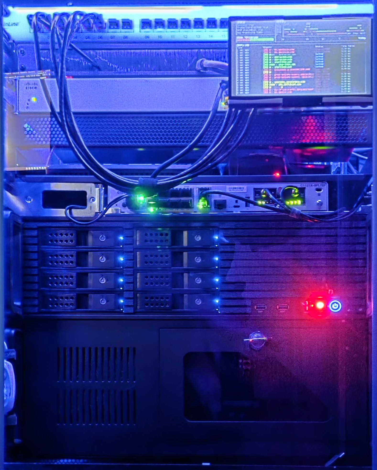 A while later the Server moved into a new (better) Server housing with Hotswappable HDD bays (for the main drives) and WAY better cooling. Another Rasperry Pi joined the family and took over the Home Assistant that was previously running in a VM on TrueNAS. Speaking of VMs, I moved all Docker Containers from their "App" install mode over to custom compose.yaml files, which gives me way more freedom and also keeps the containers updated immediately when there is a new version instead of waiting for the maintainers of the TrueNAS App catalog. I also got rid of PiHole and instead opted to use AdGuard Home. They are providing the same functionality, but AGH comes with DoT, DoH and DoQ out of the Box instead of having to manually install and configure services on the PiHole device. While swapping over I also fully segregated my network into 4 VLANs: Guest, Internal, IoT and Management. Getting the Access Control Lists to work wasn't as bad as I expected, but I of course locked myself out of the router SSH once or twice.